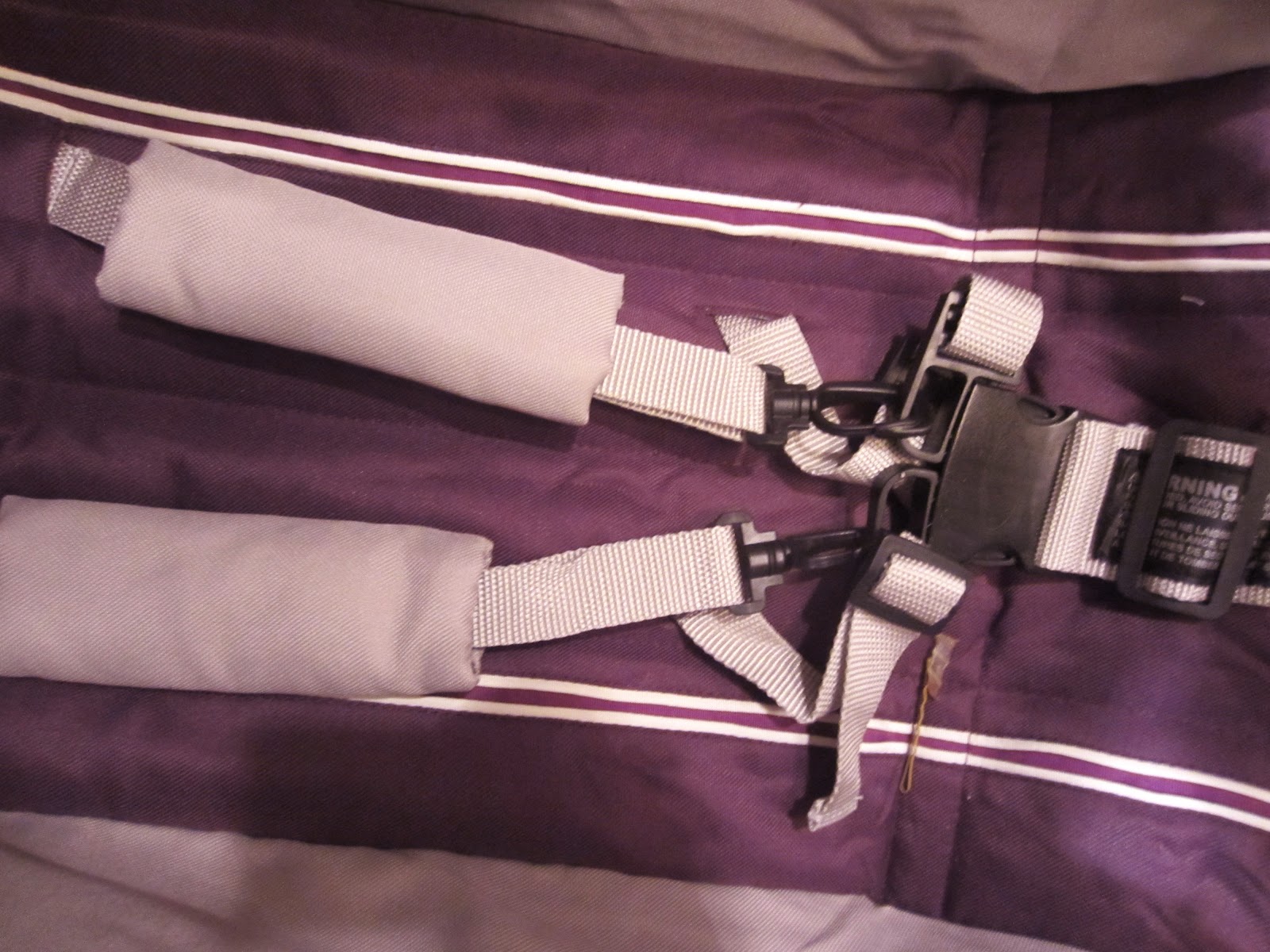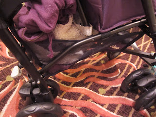 By the way, these photos are showing the vexing dichotomy of trying to portray actual colors on strollers. Because under fluorescent lighting, this shade or purple looks more plummy. Yet in the outdoor sunlight, it looks more blue grey.
