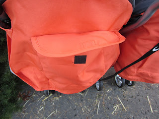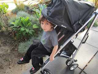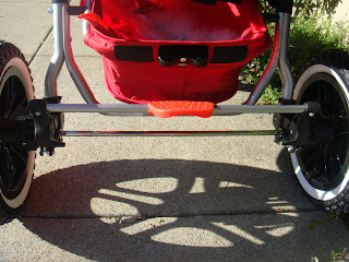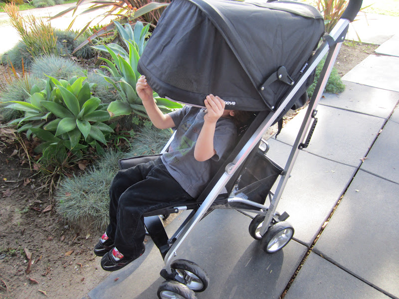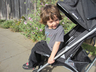 As you might imagine, it's performance on the StrollerQueen Obstacle Course was nothing less than stellar. Every time I would hit a big sidewalk crack or tree root, I would yell to SP 2.0, "Hang on! Hang on!" Because typically, my Stroller Princes would be pitched out in a stroller this small, over rough terrain. If they were not strapped in, that is. But no worries in the Emotion. Those roller blade wheels just glided over the gnarliest bumps. That is an adjustable legrest, too, by the way.