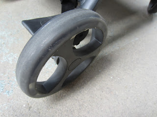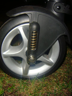 And the steering? I saved the best for last. It is AWESOME, wonderful! I pushed it one-handed along the entire SQ Obstacle Course, with no problems. Up and down grass banks, through mud, rocks, bricks, cobblestones, gravel, broken sidewalks...So no baby whiplash worries if you need to hold the hand of another little one, or the leash of a dog, or a latte', or a cell phone, or....